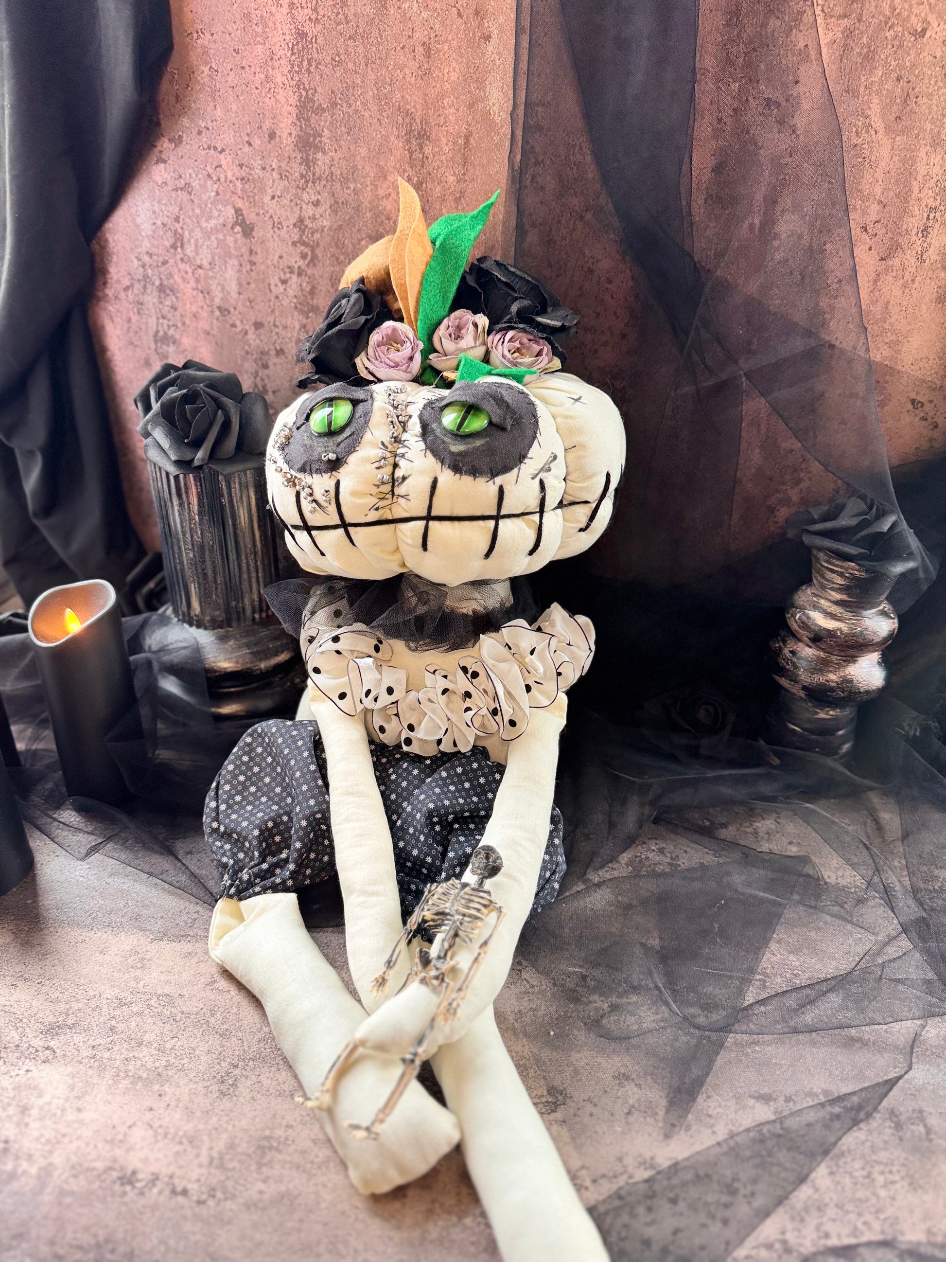 Straight from the shadows of Halloween night, this handmade pumpkin doll is a true statement piece. With haunting stitched details, eerie green eyes, and a crown of dark roses, it carries the charm of something beautifully spooky. Dressed in ghostly fabrics and holding a tiny skeleton companion, this doll is perfect for those who love the darker side of Halloween.